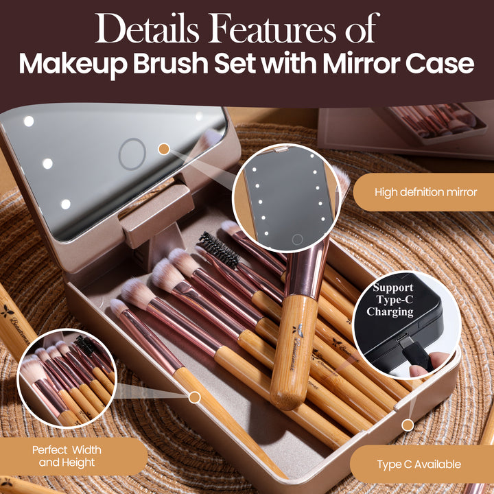 Beautimax Makeup Brush Set with Mirror Case 14PCS Travel LED Mirror Makeup Brush Set (Bamboo)