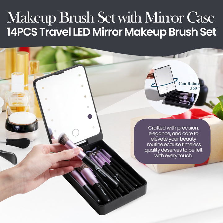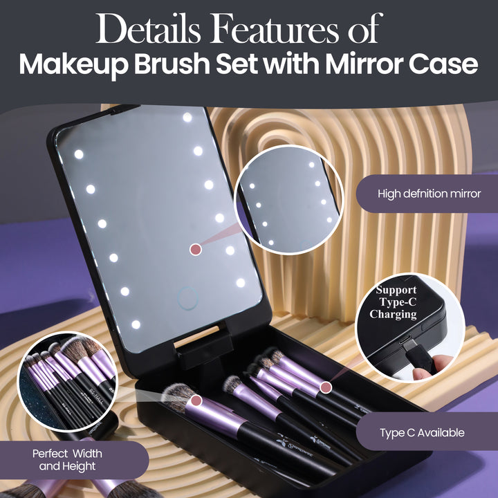 New Makeup Brush Set with Mirror Case 14PCS BEAUTIMAX Travel LED Mirror Makeup Brush Set as Gift present ( type c cable not included)