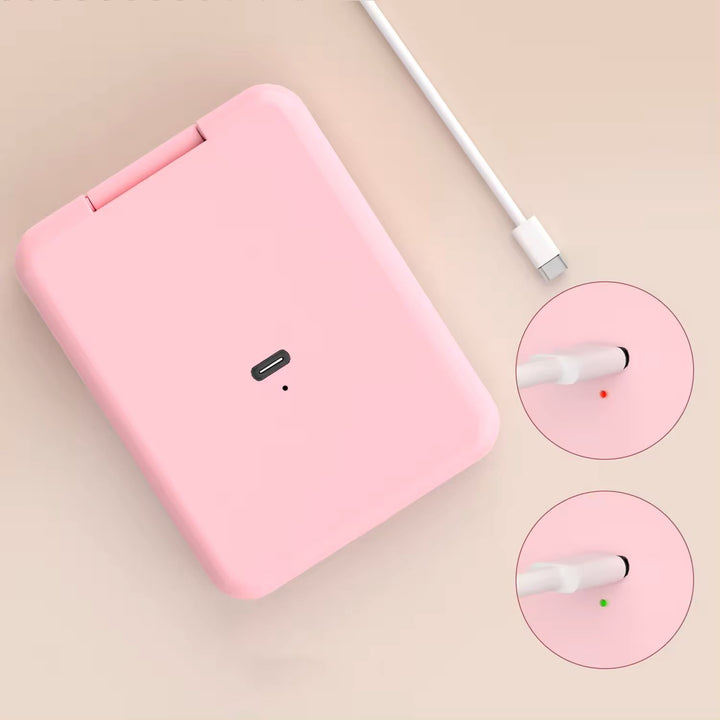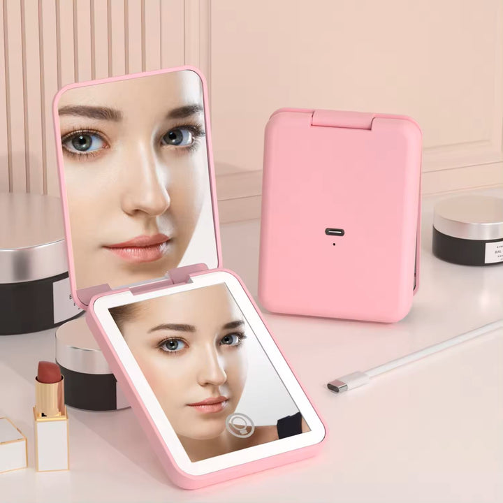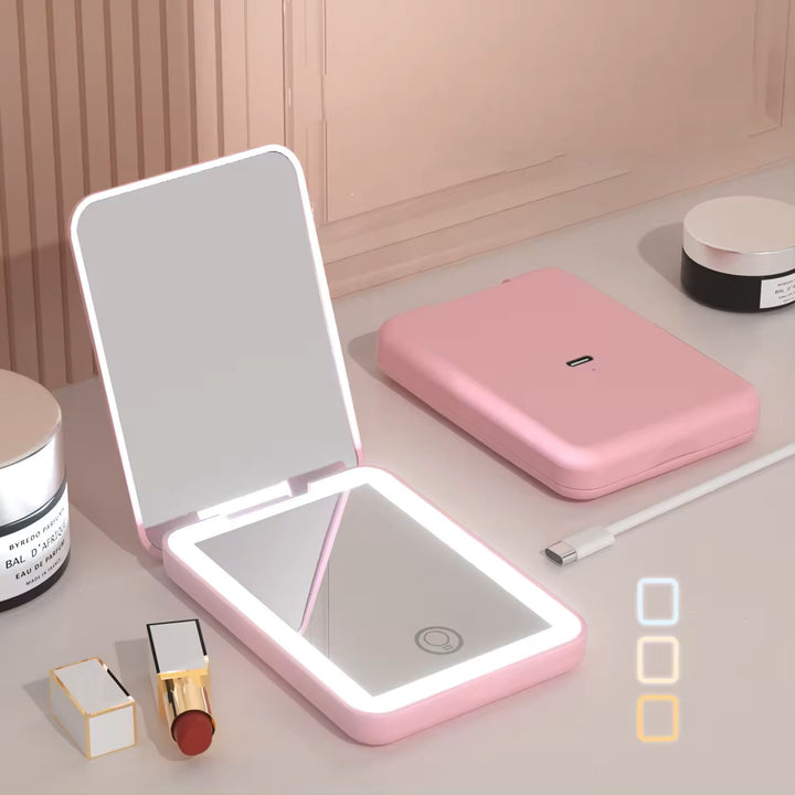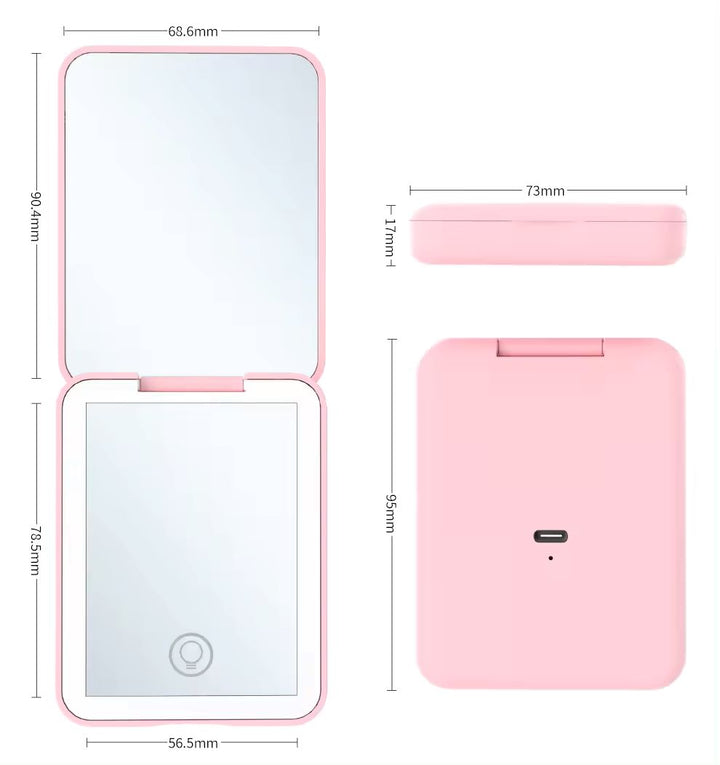 Rechargeable LED Pocket Mirror – Portable Folding Travel Mirror with Touch Light & USB Charging (Pink)
