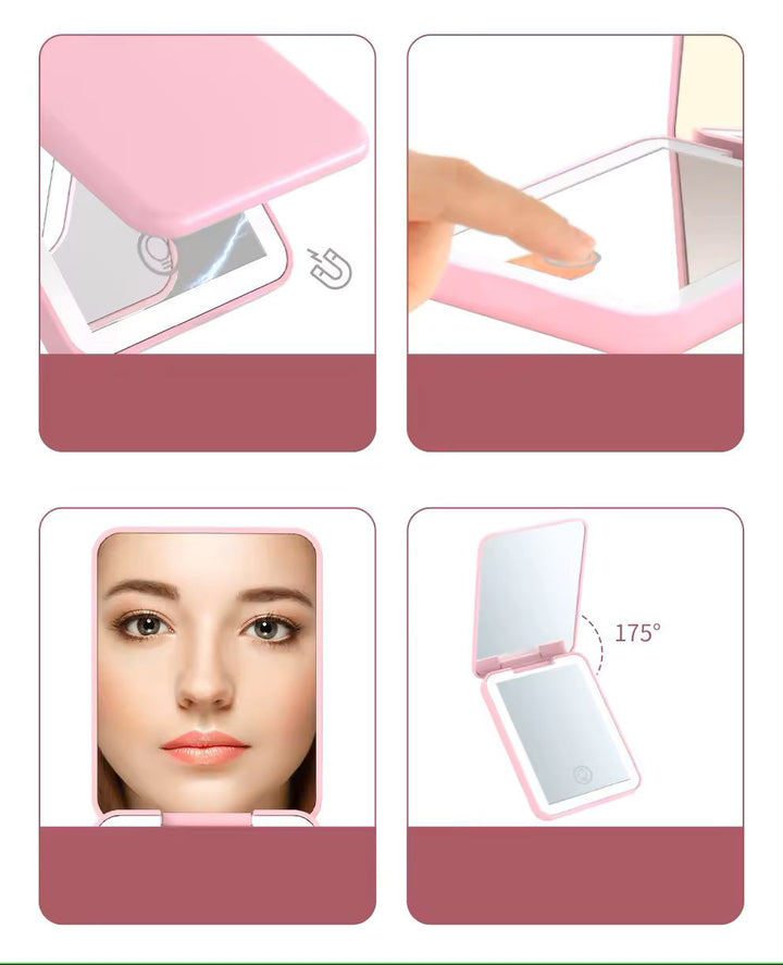 Stay flawless on the go with this rechargeable LED pocket mirror, featuring dual mirrors and a built-in touch light for effortless makeup and skincare anywhere. Designed in a sleek, foldable pink case, this compact travel mirror includes high-definition glass and bright LED lighting, perfect for low-light environments. The one-touch sensor lets you adjust brightness easily, while the USB charging port ensures long-lasting use without the need for batteries. Lightweight, stylish, and travel-ready, this mirror is your go-to beauty companion for touch-ups, travel, or everyday use.