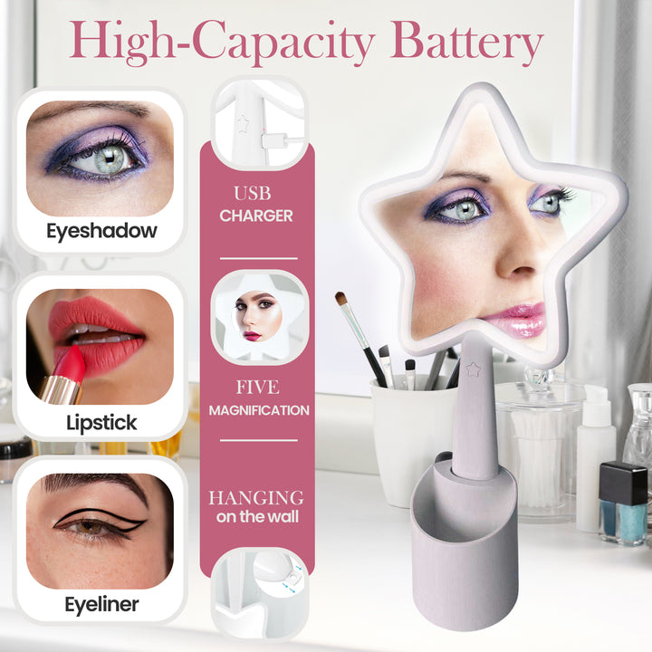 Add a touch of magic to every beauty routine with our 5 Stars Custom Portable LED Light Makeup Mirror — the perfect blend of style, convenience, and elegance. Designed in a charming star shape, this compact vanity mirror is lightweight, travel-friendly, and beautifully crafted for women who love beauty on-the-go.
